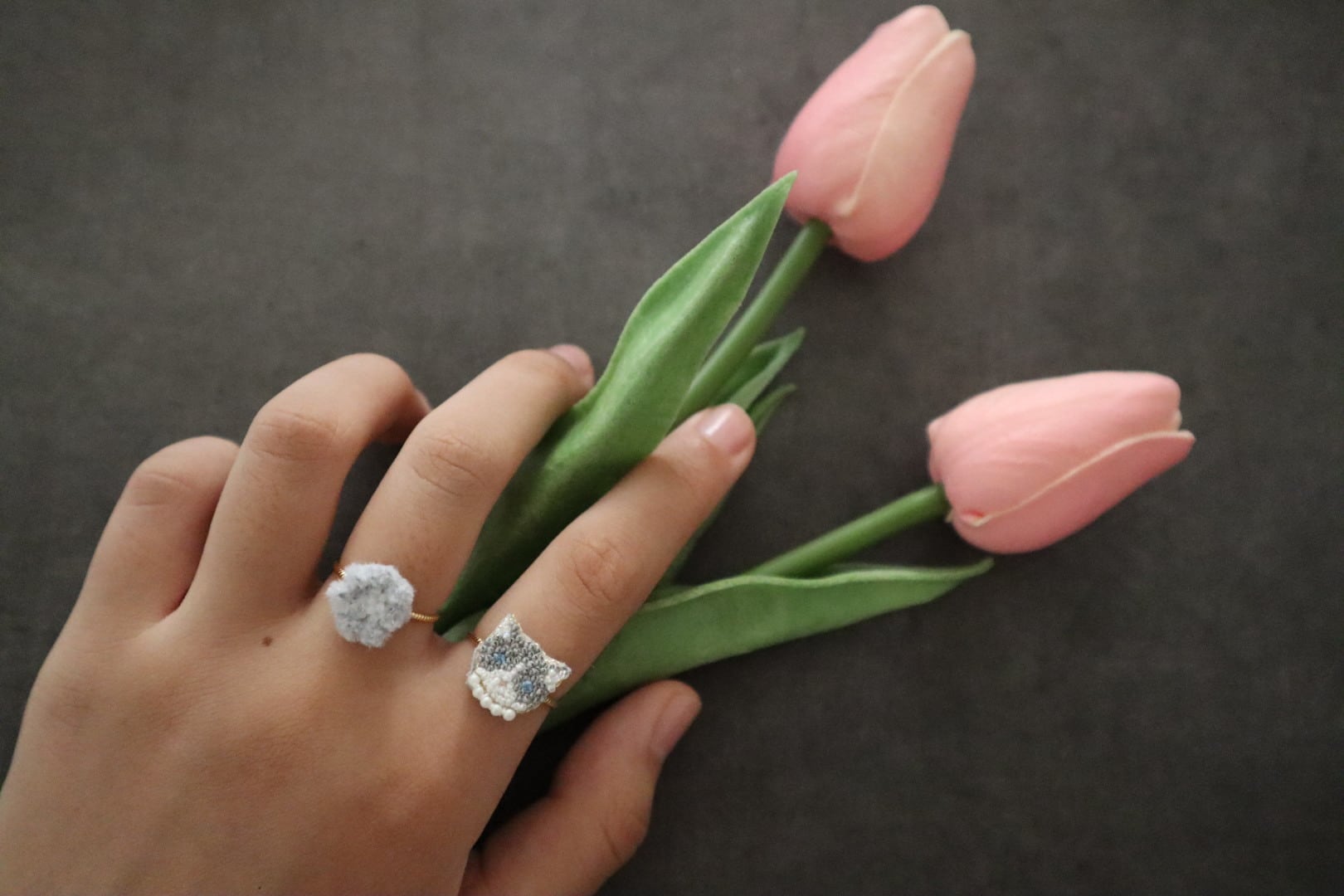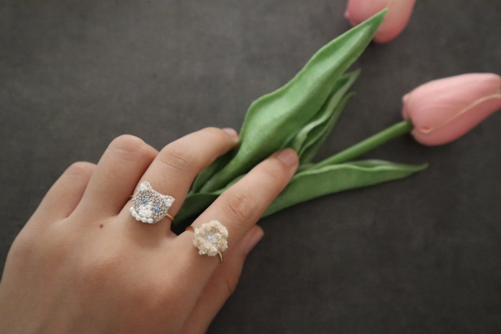 ◎2つ目は、モール糸のフレンチノットでふんわり丸いモチーフのリング。グレー、ベージュ、ホワイトから色を選べます。ネコのリングやお手持ちのリングと重ねづけすると可愛い秋冬のリングです!